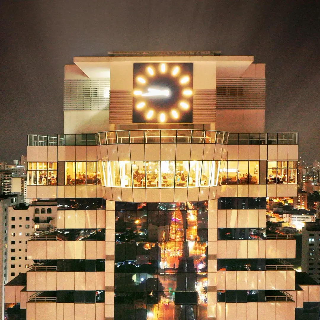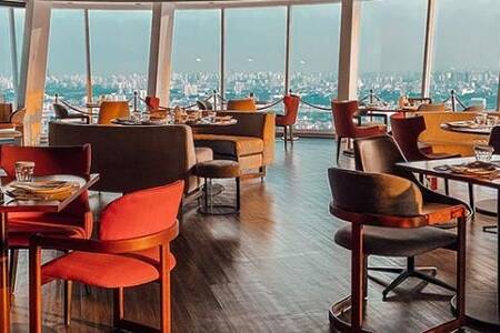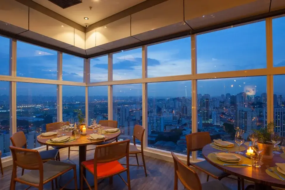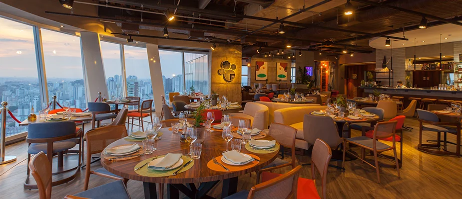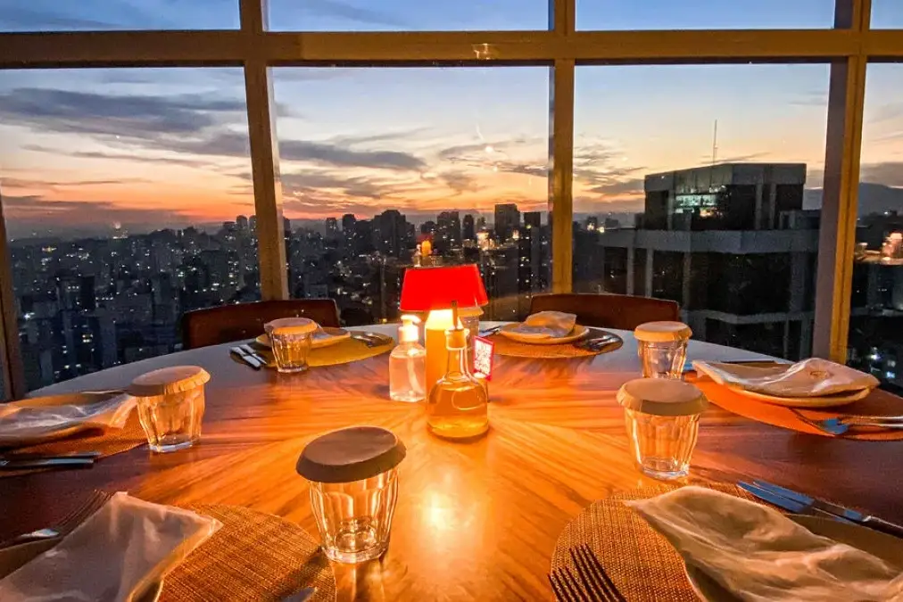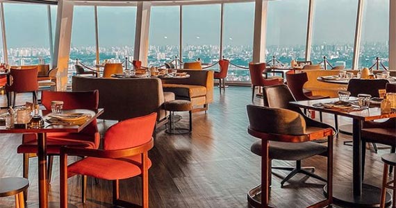 O piso giratório do nosso restaurante rooftop, enriquece sua experiência ao revelar uma vista de 270º, que se estende do Pico do Jaraguá até a exuberante Serra do Mar.