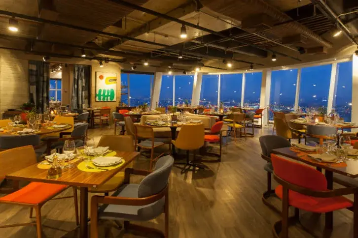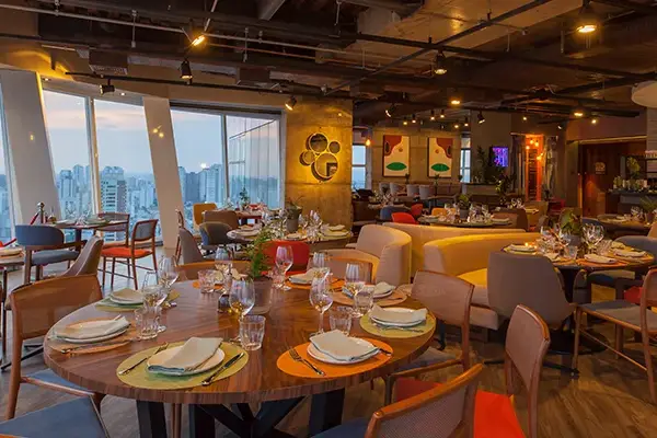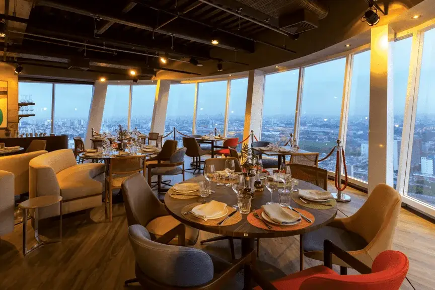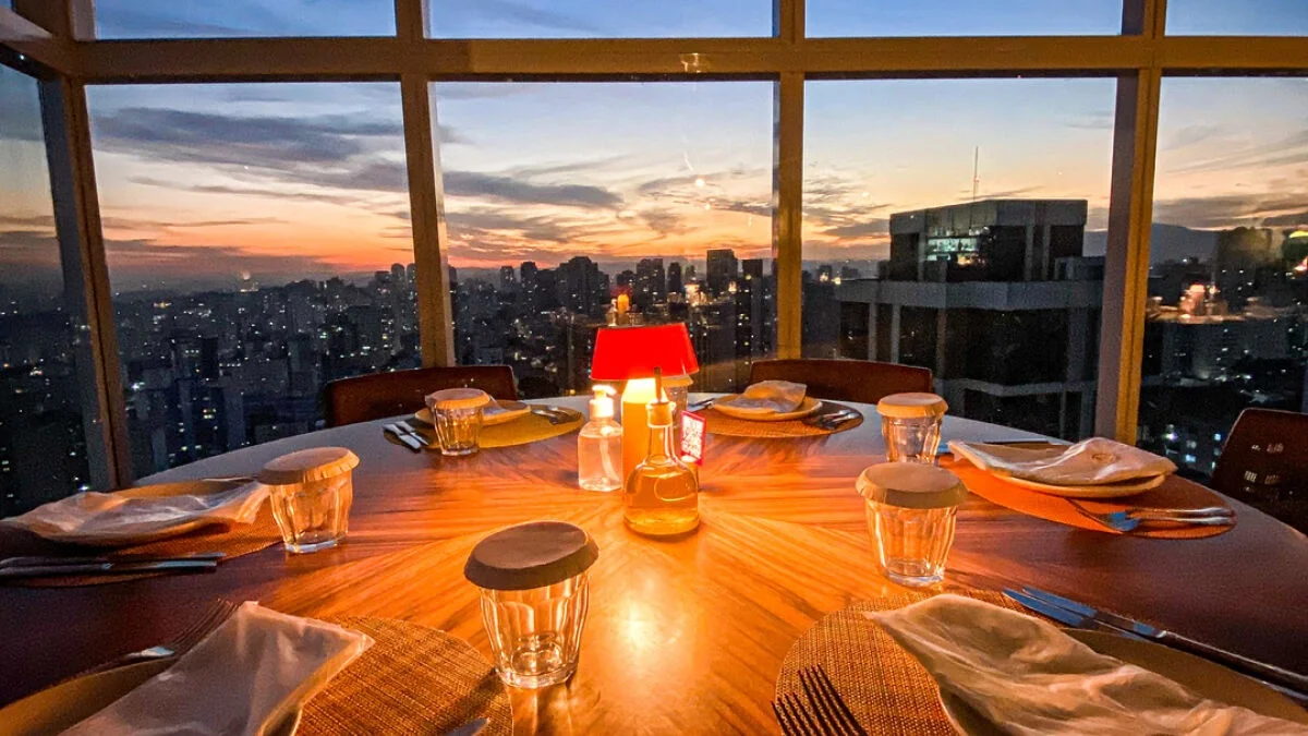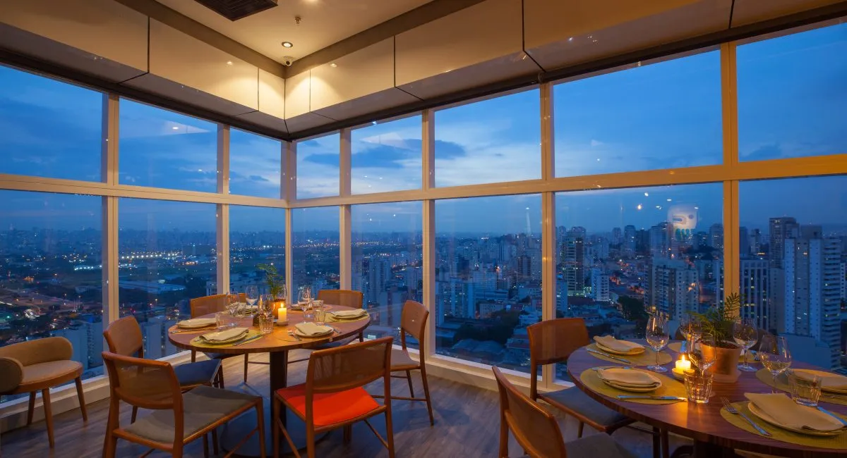 Do alto do 28º andar do icônico Edifício K1, no bairro de Santana, o restaurante Lassù, com seu salão giratório, oferece uma experiência memorável, emoldurada por uma vista única da cidade de São Paulo.